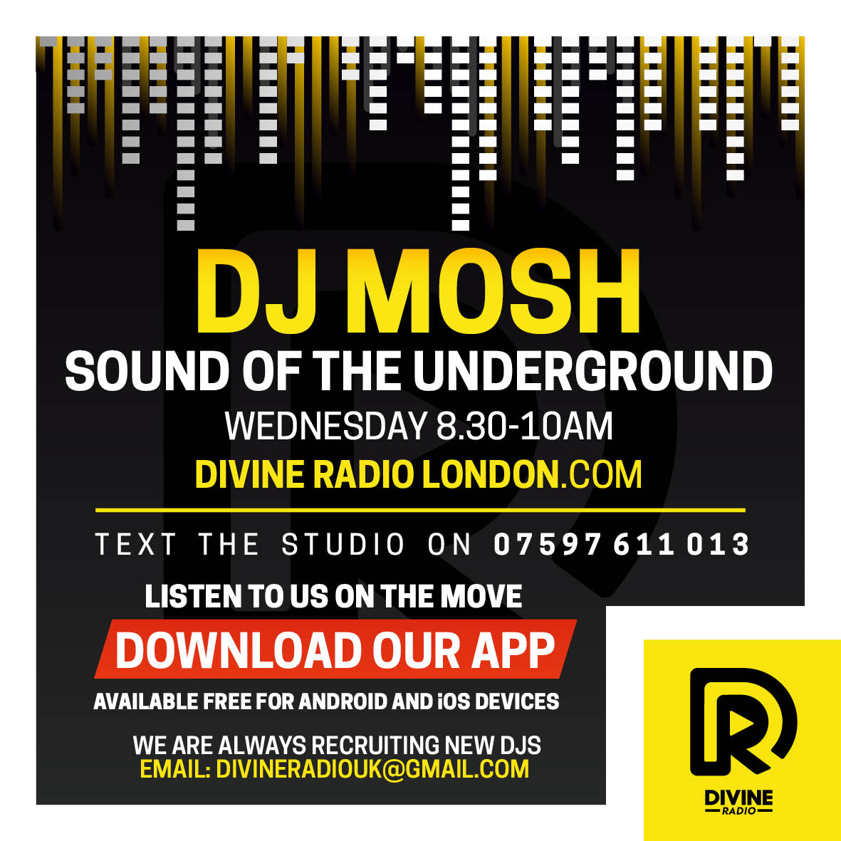 You can Listen to Jungle from Mosh playing upfront & dirty basslines on our app and live on Divine Radio London. Divine Radio London is London’s premier station and mobile app for House Music.